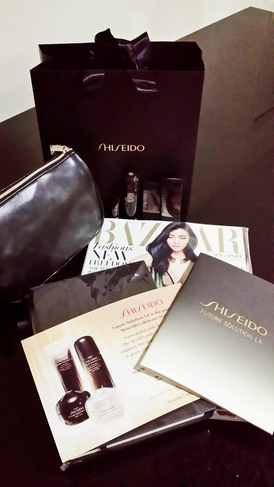 The goody bag with the Shiseido samples and the Bazaar magazine. The chic black accessories bag come in handy as my old one is giving way.