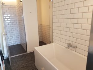 - Spacious bathroom with a bathtub with river view and separate rain shower